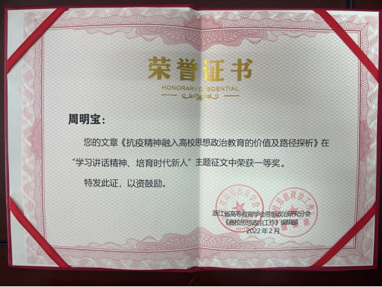 近日,浙江省高等教学学会思想政治研究分会面向全省高校举办的“学习讲话精神 培育时代新人”主题征文活动结果揭晓,公司周明宝老师撰写的《抗疫精神融入高校思想政治教育的价值及路径探析》喜获一等奖。
