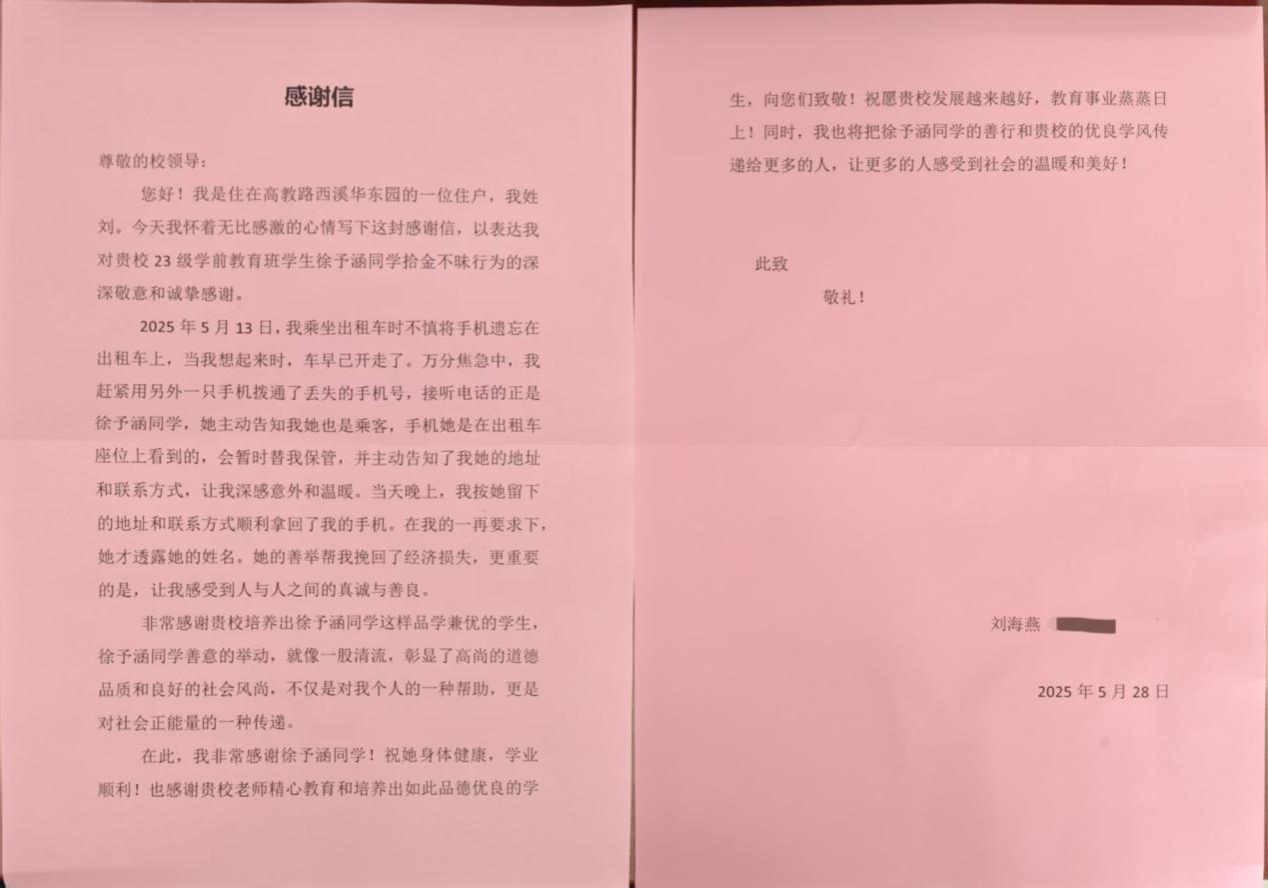 5月13日,公司2023级学前教育专业员工徐予涵同学在出租车内拾获一部手机。在失主尝试拨通丢失手机时,她没有丝毫犹豫,秉持着拾金不昧的传统美德和诚实守信的优良作风,告知失主会暂时保管手机,并主动提供地址和联系方式。最终,成功将手机完好地送还到焦急的失主手中。为了表达真挚的感激,5月28日,失主特别写下了一封情真意切的感谢信。信中,失主高度赞扬了徐予涵同学主动担当、不求回报的高尚品格,并对公司培养出品行如此优秀的员工表示由衷的敬意。一封薄薄的感谢信,满载着对青年学子高尚行为的真诚赞许与深深感动。