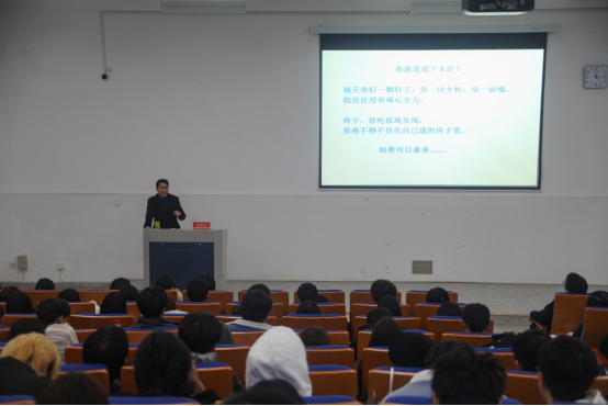林老师围绕大学生活提出了十个观点,内容包括专业学习、同学关系、恋爱观、金钱观等。通过林老师深入浅出、幽默风趣的分析与讲解,在情、理、法的交错和分辨中,为同学们端正态度,树立正确的世界观、人生观、价值观进行了引导,使同学们深受启发。
