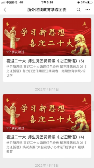 公司以《之江新语》理论经典为载体,在公司团委公众号持续做好师生党、团员有声朗读系列推送活动,至今已推送8期,把广大青年的思想和行动统一到喜迎党的二十大上来,教育引领青年树立深厚的家国情怀。